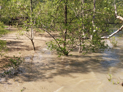 Borneo : gently lapping waves near seaward mangrove.