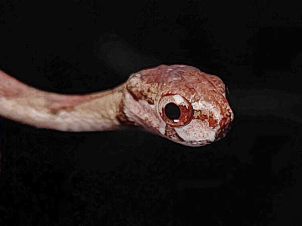 There are pale markings on the head, and the eyes are large.